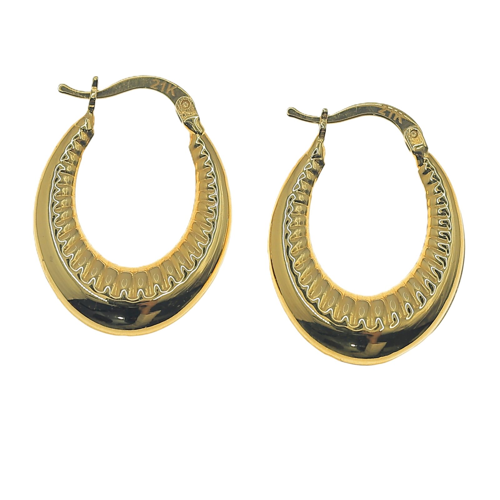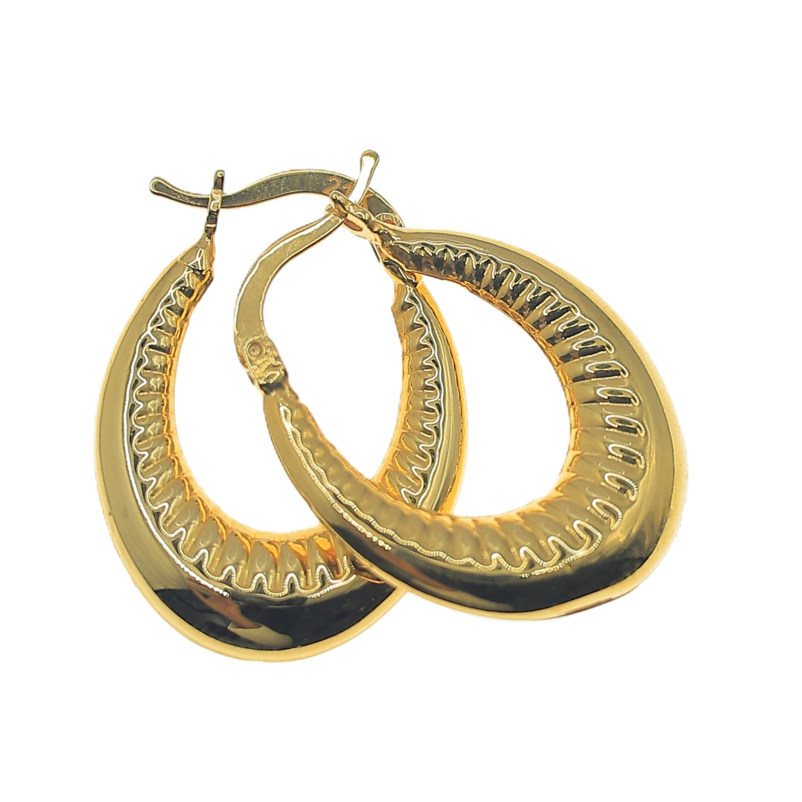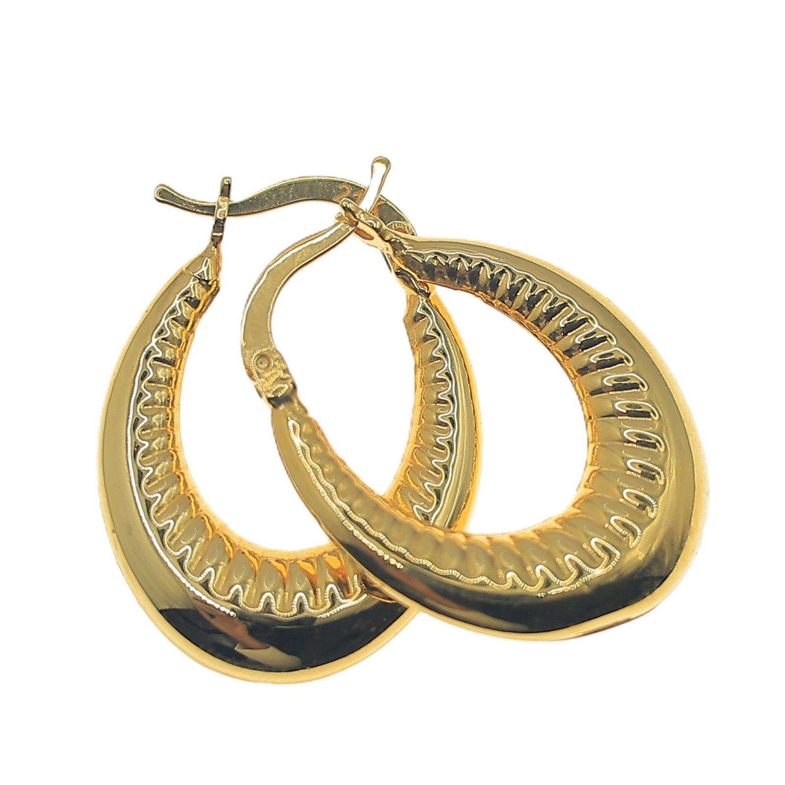 حلق ذهب بتصميم بيضاوي أنيق، شكله الانسيابي يبرز جمال الويه ويعطي لمسة ناعمة وأنثوية. قطعة بسيطة بس فخمة، وتلبق مع كل إطلالة… من الشغل لين السهرة.