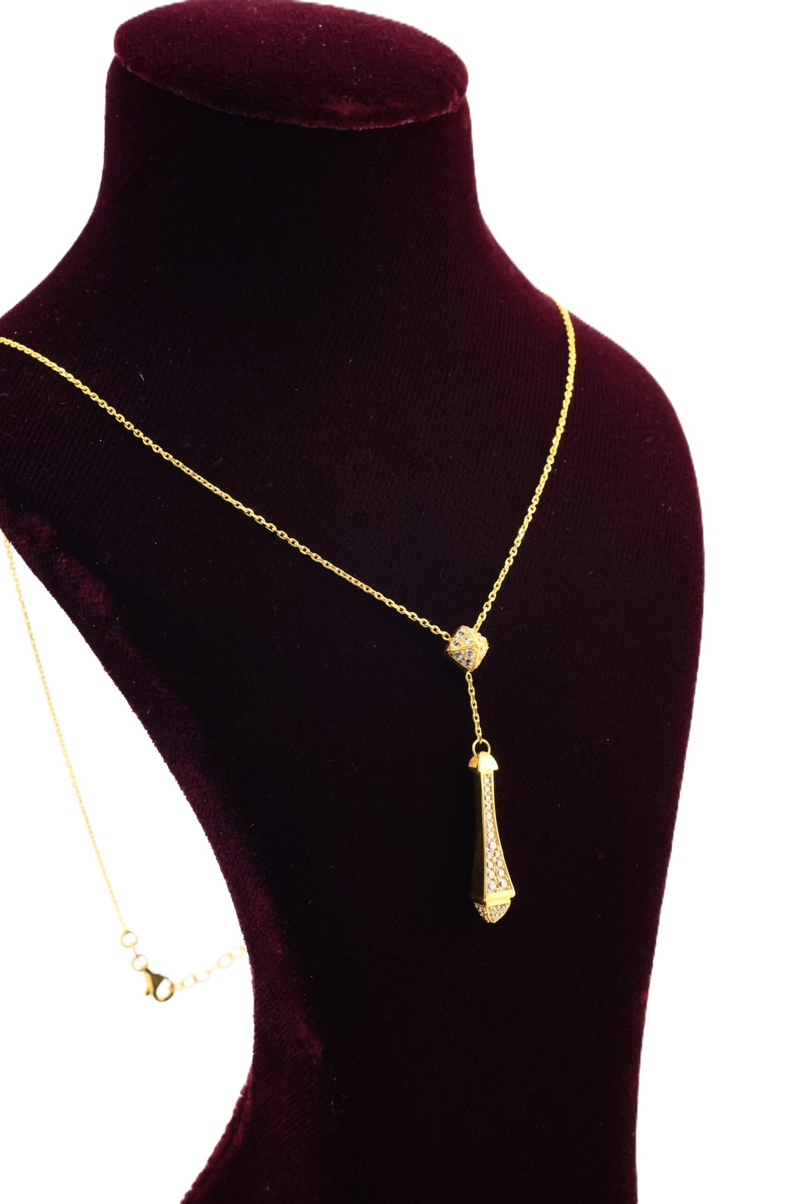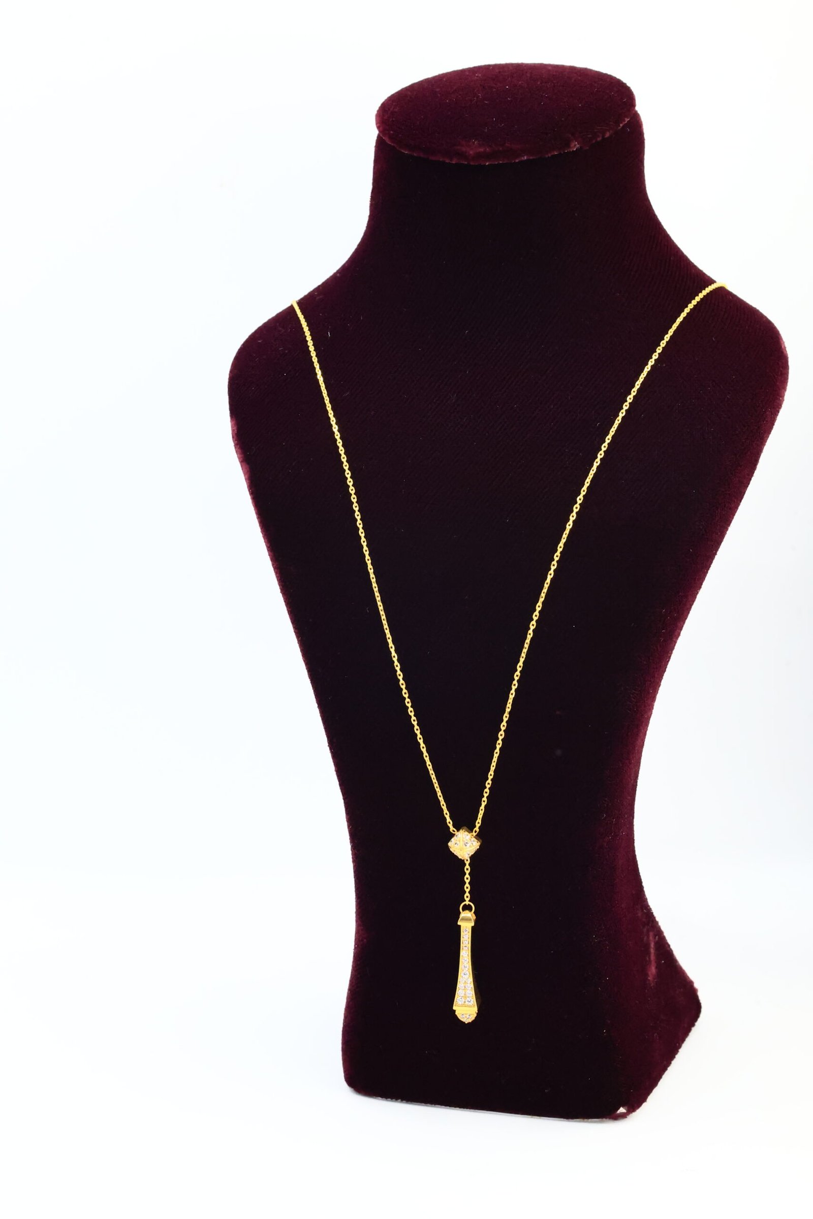عقد ذهب بتصميم برج إيفل، شغله فخم ولمعته تشبه الألماس وتخطف العين من أول نظرة. التصميم أنيق وناعم، يعطي إحساس بالرقي والرومانسية مع لمسة عصرية.