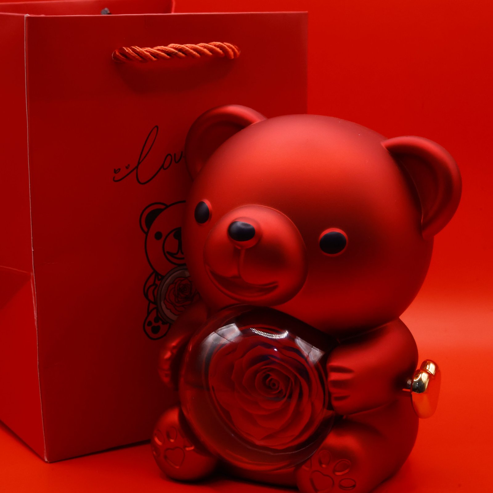 دبدوب أحمر أنيق يحمل وردة ساحرة، وبلمسة دوران بسيطة تتحول الوردة إلى خاتم ذهبي يخطف القلوب 💍✨